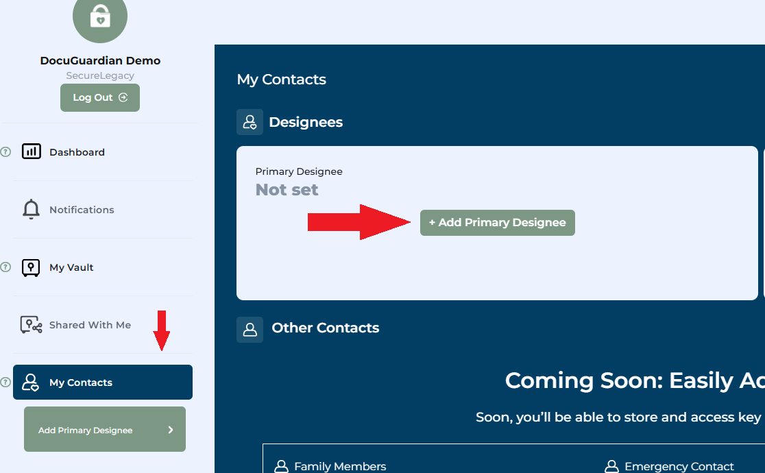 The process of assigning a Primary Designee in DocuGuardian is straightforward and secure. Follow these steps to designate someone: